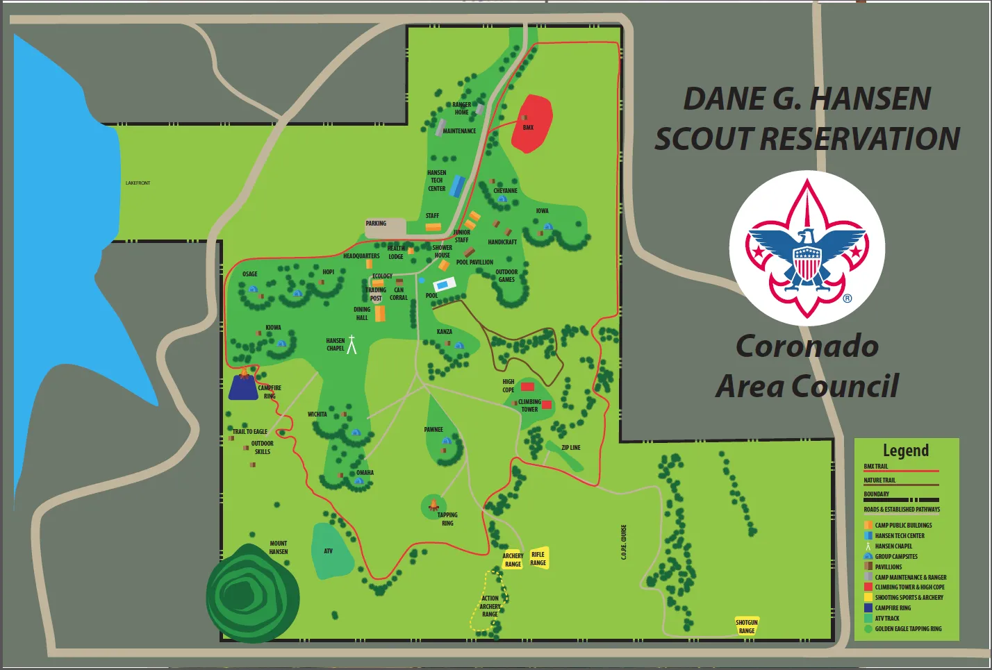 Camp Hansen is the setting for many events including Cub Adventure Camp, Scouts BSA Resident Camp, TOSS Camp, and NYLT. Programming includes over 35 Merit Badges, nine of which are Eagle Scout required. Trail to Eagle, the first year camper program, offers most of the requirements for Tenderfoot, Second Class and First Class. Other programming includes kayaking, snorkeling, ATV, shooting sports, 3D archery, COPE, mountain boarding, mountain and BMX biking, as well as a variety of other camp programs.